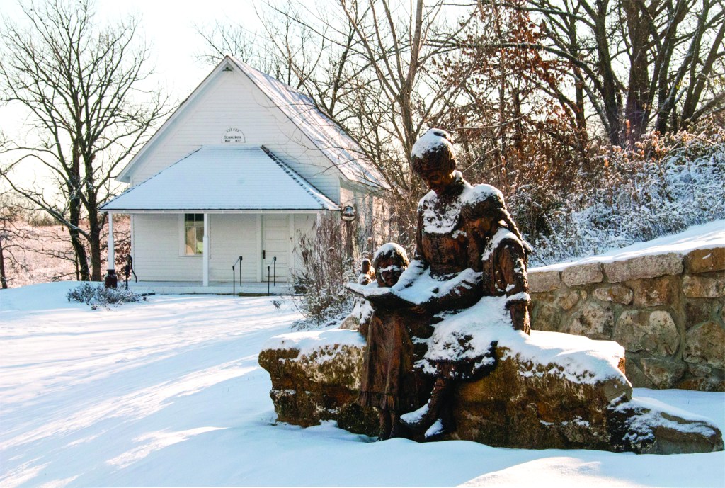 The school’s companion work of art represents a unique collaboration driven by the Leawood Foundation, in cooperation with the Leawood Historic Commission and the Art in Public Places Initiative of the Leawood Arts Council. Representatives from each group selected Dennis Smith and commissioned the design of the piece to represent the nurturing role teachers play in children’s lives. This sculpture was funded by private donations to honor the importance of teachers throughout history in our area. The life-sized bronze is a tribute to the contributions of the one-room schoolteachers, through present-day educators, to Kansas society.